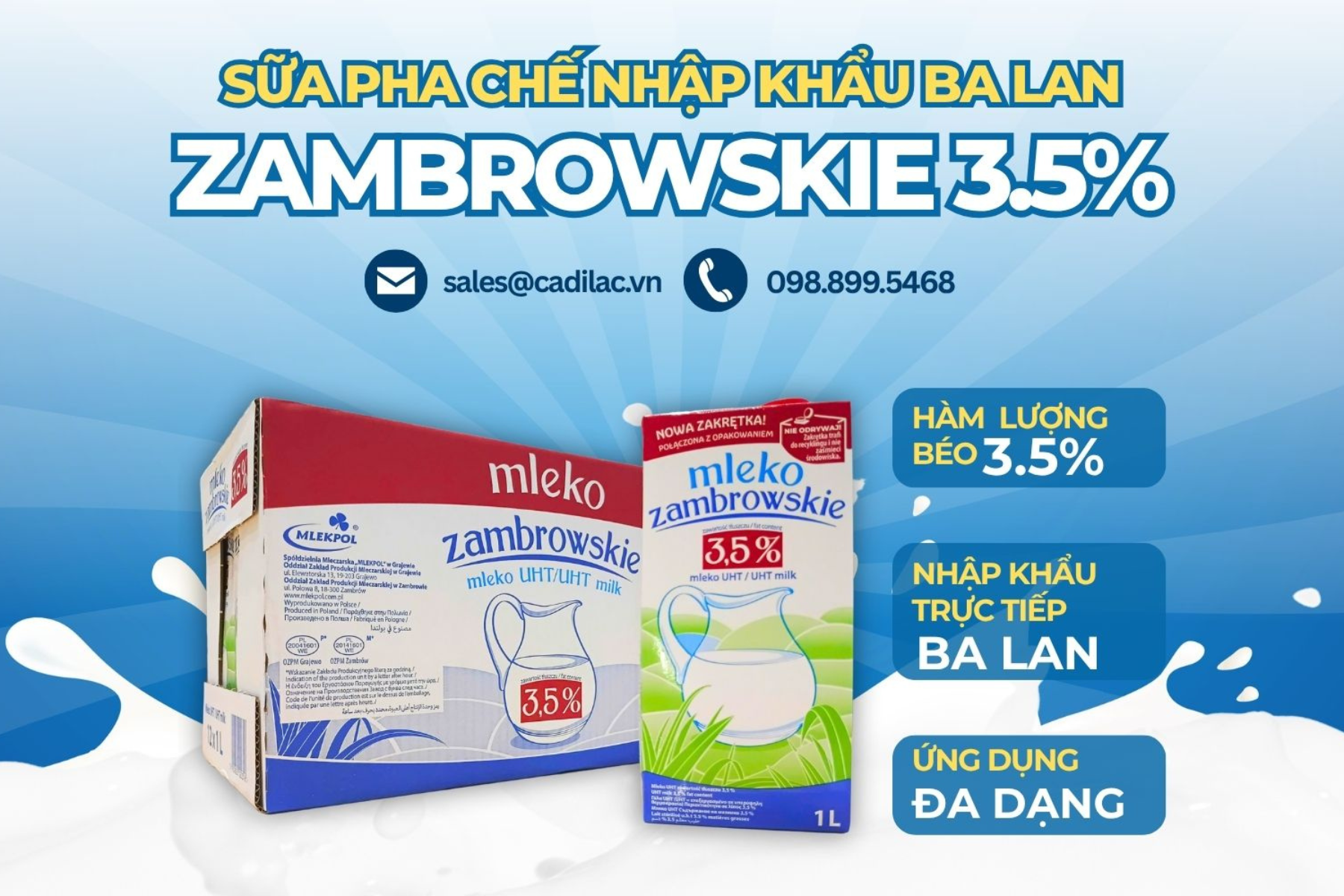 Sữa tươi Zambrowskie (Mlekopol, Ba Lan) gồm 3.5% nguyên kem & 1.5% tách béo: ổn định cho pha chế cà phê, trà sữa, nấu nướng. Giá cạnh tranh. Cadilac Việt Nam phân phối độc quyền.
